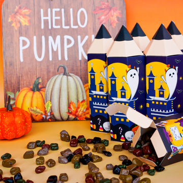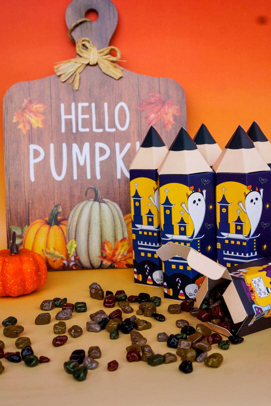 Pietricelele noastre din ciocolată cu lapte, cunoscute pentru textura lor fină și aroma bogată, se regăsesc acum într-un ambalaj vesel, în formă de creion, decorat festiv pentru sărbătoarea de Halloween.